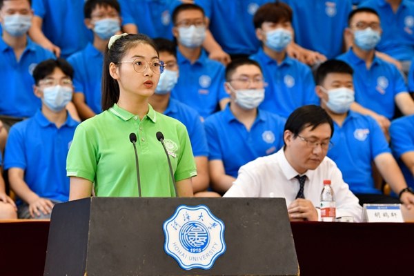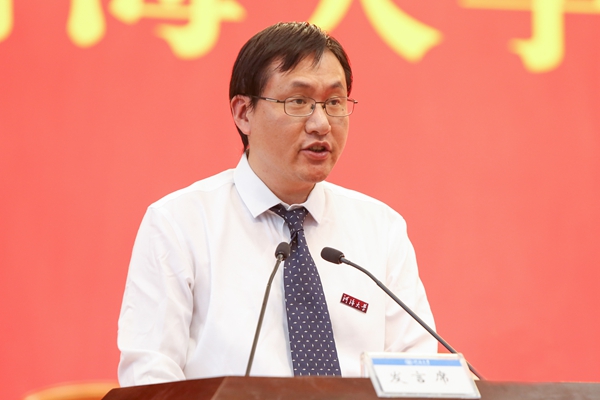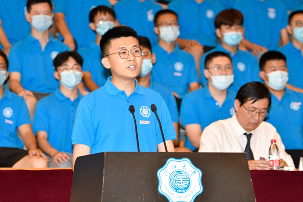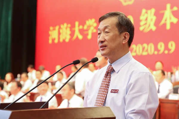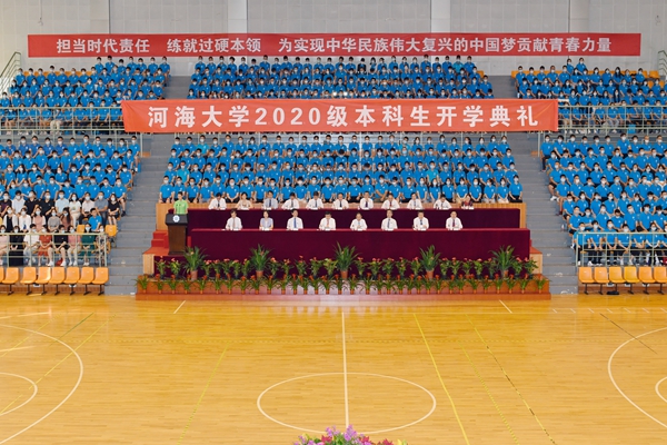 教师代表信息学部胡鹤轩教授对2020级本科新同学表示热烈欢迎,并结合自身经历和执教经验,建议同学们在大学阶段要爱国爱校、锤炼品德修为;学会自学,提高学习效率;拓展视野,完善知识结构。2017级地球科学与工程学院谢威夷同学和机电工程学院同学谷昱昊作为在校生代表发言,分享了自己的学习生活感悟,鼓励新同学们不负韶光,不忘初心,做努力奔跑的河海逐梦人。新生代表2020级农业科学与工程学院何晨阳同学和商学院王啸天同学献辞,表示将始终谨记校训精神,以追求卓越的气魄、脚踏实地的姿态,砥砺前行,不负韶华。