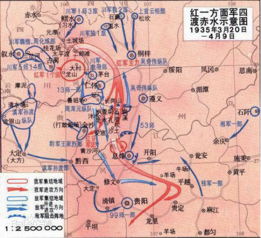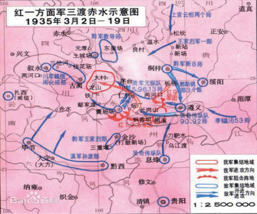 赤水河,一条颇为神秘的河流,“每遭雨涨,水色浑赤,河以之名也”。1935年初,红旗漫卷赤水河,遵义会议上东山再起的毛泽东,指挥濒临绝境的中央红军,四渡赤水,来回穿插,把几十万国民党大军打得人仰马翻、晕头转向,红军转危为安,创造了中外战争史上的奇迹,被誊为“天马行空,是天才的神来之笔”[1]。