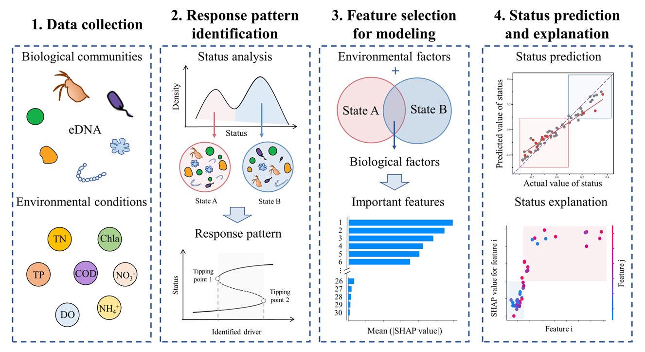 生态系统对环境压力的响应规律往往是复杂非线性的,这为预测模型的开发带来了挑战。针对这一问题,研究团队将机器学习方法与多稳态理论相结合,在探究了河流浮游生物群落生态状态的基础上,采用监督机器学习模型对浮游生物群落的生态状态进行了预测,并进一步提出了用于多稳态河流水生态系统状态预测的基本框架(图3),研究结果可为城市河流的水生态监测与评估提供参考。