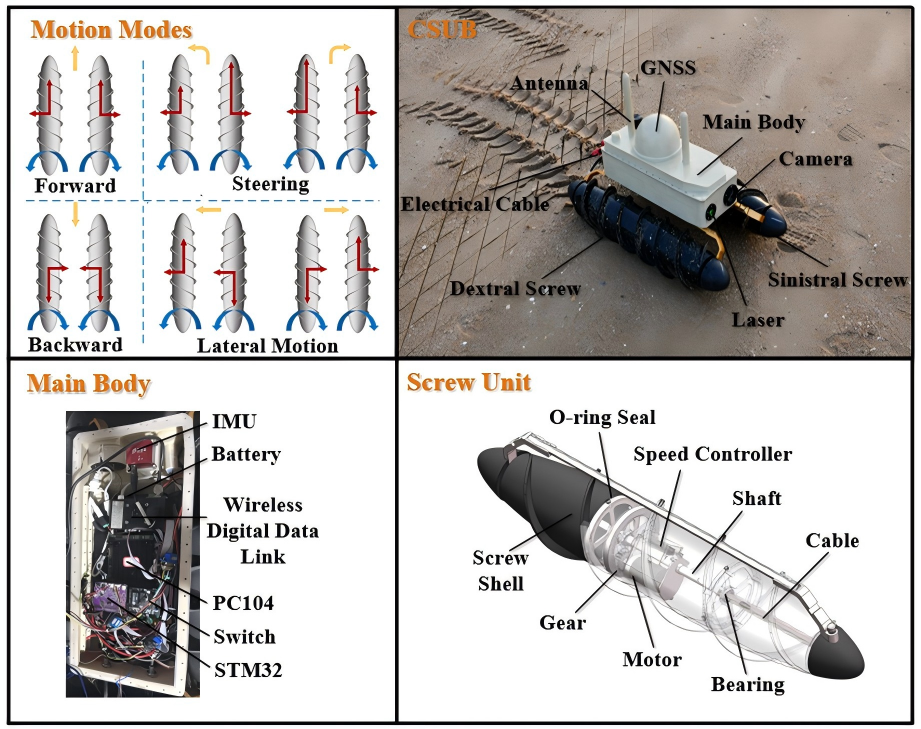 近日,《Journal of Ocean Engineering and Science》以“CSUB: Design and modeling of an autonomous screw‑driven amphibious vehicle”为题发表了我校海洋学院徐鹏飞教授团队在水陆两栖无人装备领域取得的重要研究进展,详细介绍了基于“Coastal, Surface, Underwater & Benthic”(岸海潜底)多栖作业理念研发的螺旋驱动水陆两栖无人平台“CSUB-1”(图1),系统展示了该水陆两栖无人平台的设计、仿真及性能评估结果。