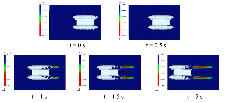 为深入揭示其中的科学问题,团队开展了一系列水动力数值模拟,探究了螺旋设计参数对螺旋推进性能的影响,提出了螺旋体在水中推进的力学模型。在此基础上,创新性地提出了一种带桨叶的螺旋体结构,进一步大幅提升了水下螺旋驱动效能。