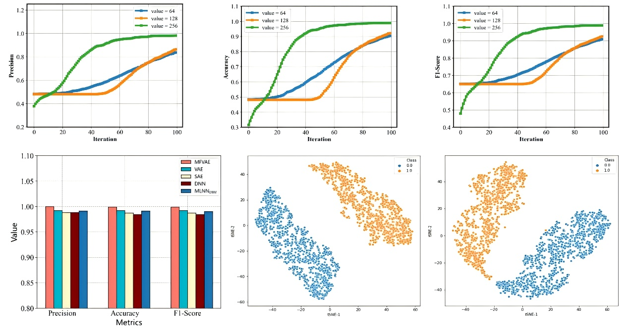 在模型对比实验中,MFVAE在测试集上的精度达到99.9%,F1值为0.999,在所有评测指标上均优于其他模型,表现出更强的稳定性和鲁棒性。进一步的可视化实验也表明,高层次特征与低层次特征在信息表征上具有明显互补性,两者融合显著提升了模型的分类能力(图3)。这些结果验证了MFVAE在齿轮箱故障诊断任务中的优势,为复杂工业系统的智能监测与预测性维护提供了新的方法支持。