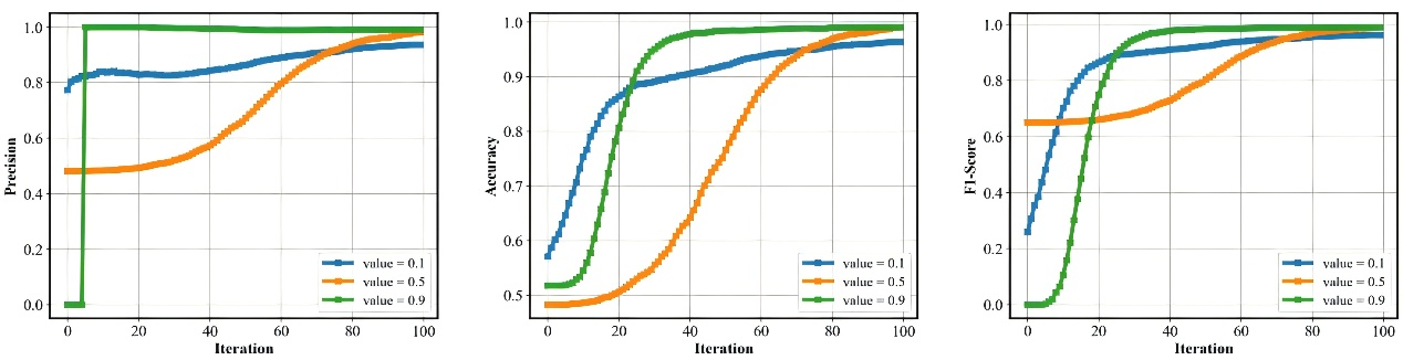为探究MFVAE模型在不同参数设置下的性能表现,设计了不同参数的实验,结果表明模型在多种设置下均保持较高精度与稳定性,其中当低层次特征权重较高时,整体性能达到最优(图2)。